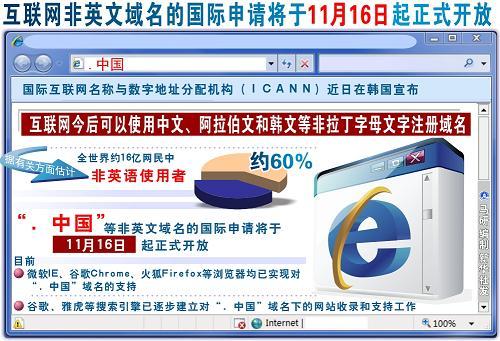 我國域名注冊管理機構中國互聯網絡信息中心(CNNIC)16日在京宣布,已代表中國正式向國際互聯網名稱與數字地址分配機構(ICANN)遞交了“.中國”域名國際申請。這意味著“.中國”域名已進入全球啟用倒計時,預計最早在明年初全球華語網民就可以使用中文域名訪問網站。