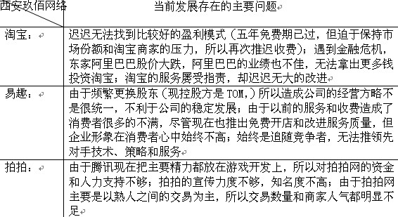 另外一點(diǎn)值得注意的是,據(jù)數(shù)據(jù)顯示,二三線城市正在逐漸成為網(wǎng)購市場的主力軍,福建、山東、湖北、遼寧、四川等二三線地區(qū)排名迅速上升,成為網(wǎng)購的主力,這些地區(qū)的網(wǎng)購交易額已經(jīng)占到總交易額的一半左右。而且這種趨勢還會維持下去,面對C2C這個在中國蓬勃發(fā)展的領(lǐng)域,百度這時的切入應(yīng)該說是恰到好處的。 (二)主要競爭對手均遇到麻煩