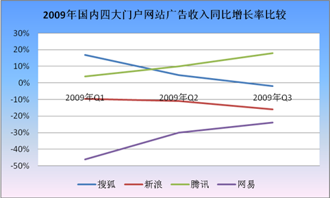 2008年Q3,受到北京奧運巨大營銷契機的拉動,國內四家主要門戶網站分別創出了業績新高。一年之后,經受了金融危機的門戶網站開始業績復蘇,接近甚至超越2008年Q3的收入峰值。根據財報,騰訊網絡廣告收入增長迅速,同比增長17.9%。而搜狐網絡廣告收入也僅較去年同期相差2%。不過,值得注意的是,由于2008年Q3業績較高,新浪、網易廣告收入還是較同期出現大幅下滑。