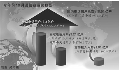 記者昨天從工業(yè)和信息化部了解到,截至10月底,我國的電話用戶總數(shù)已達到10.51億戶。同時,今年累計新增互聯(lián)網(wǎng)寬帶用戶1800.8萬戶,寬帶用戶總數(shù)突破億戶大關(guān)。