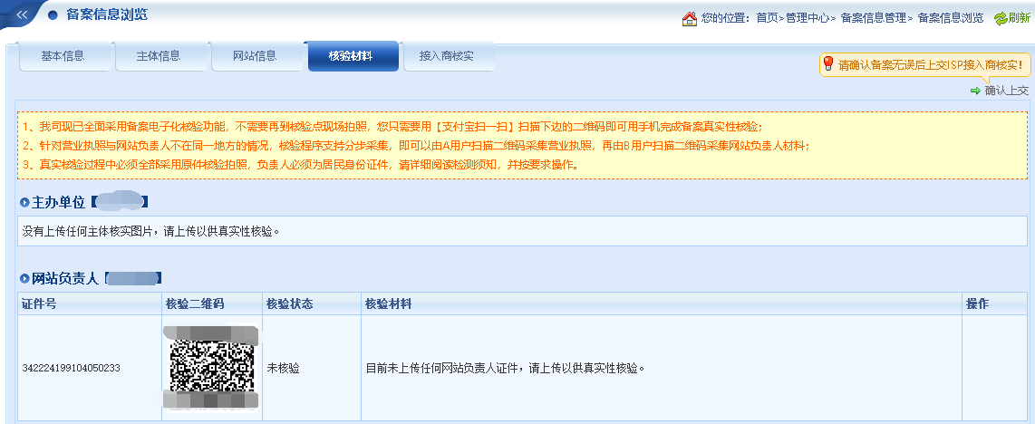 點擊“核驗證件”,核驗通過進入網站負責人信息核驗